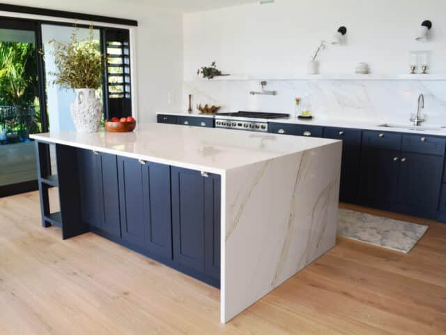 This rich Navy Blue shaker kitchen features a stylish and modern kitchen with a predominantly dark colour scheme.