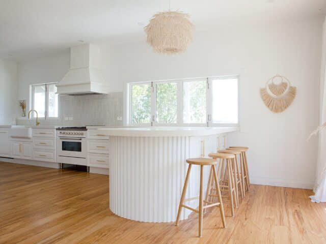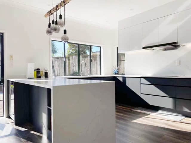 A design brief of dark, moody tones and wood accents served as the foundation for this kitchen. The obvious choice for the focal point was the custom Island Benchtop with a cantilevered tabletop.