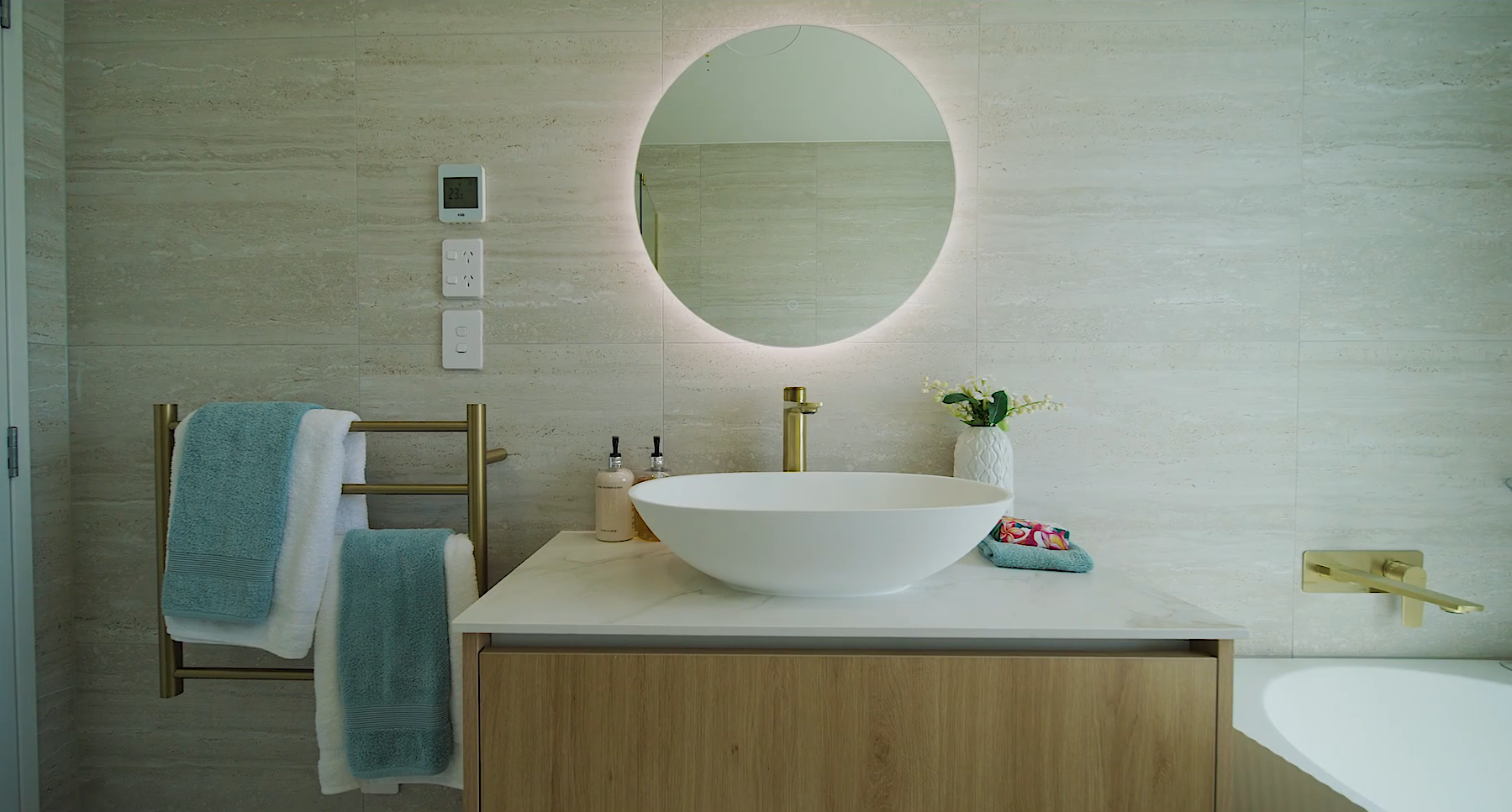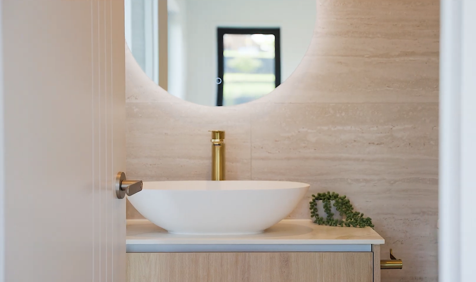 - Warm timber pairing — complements flooring and softens stone finishes.