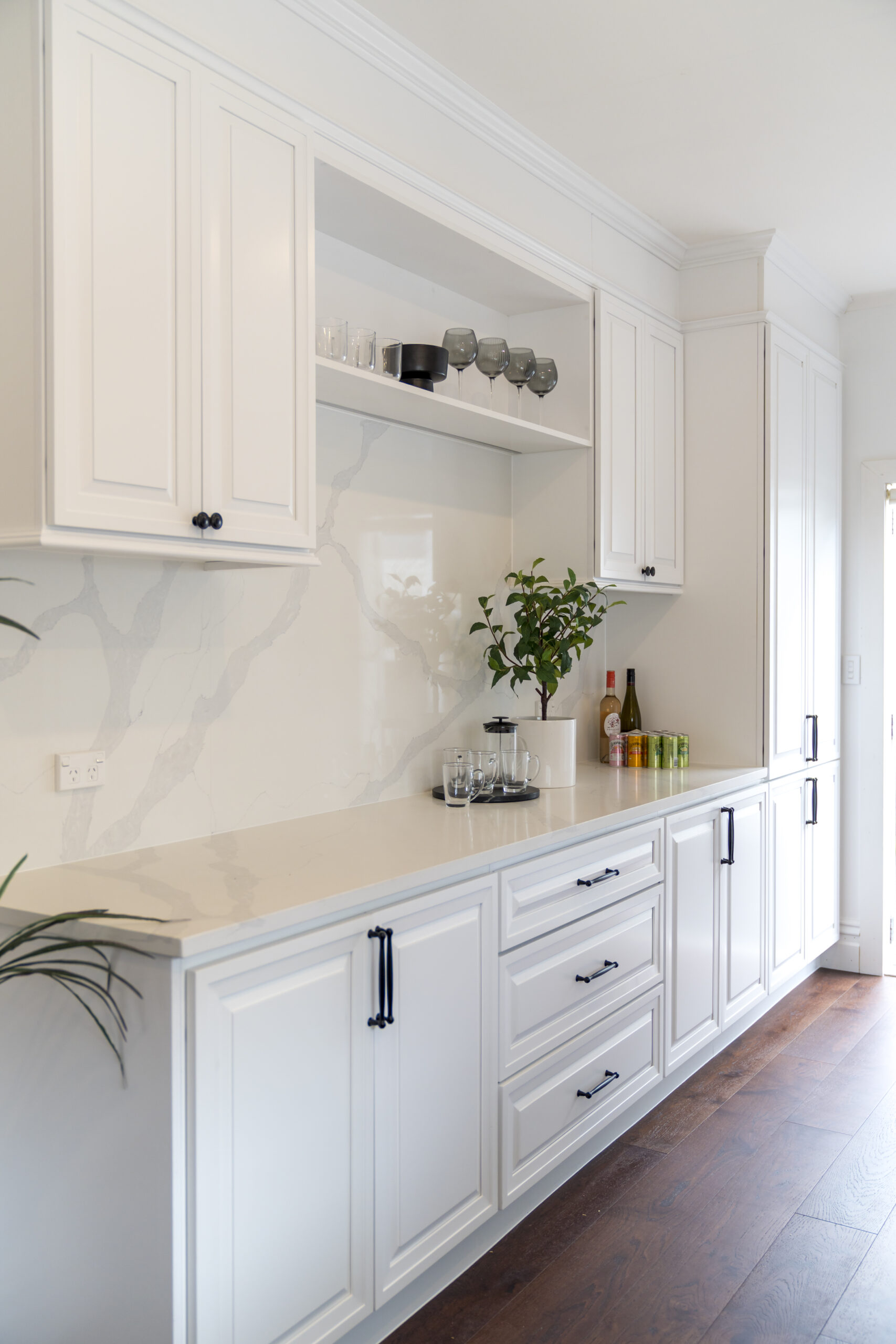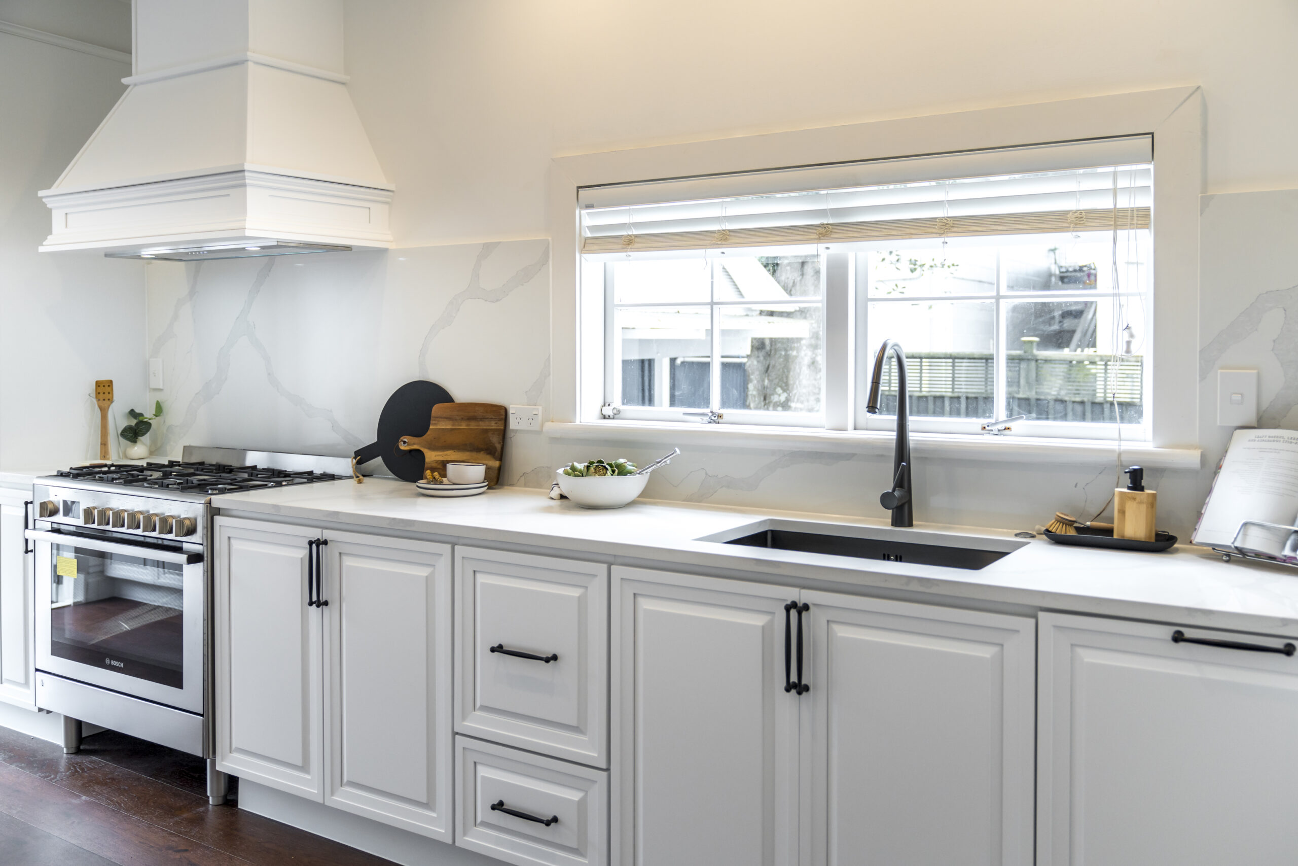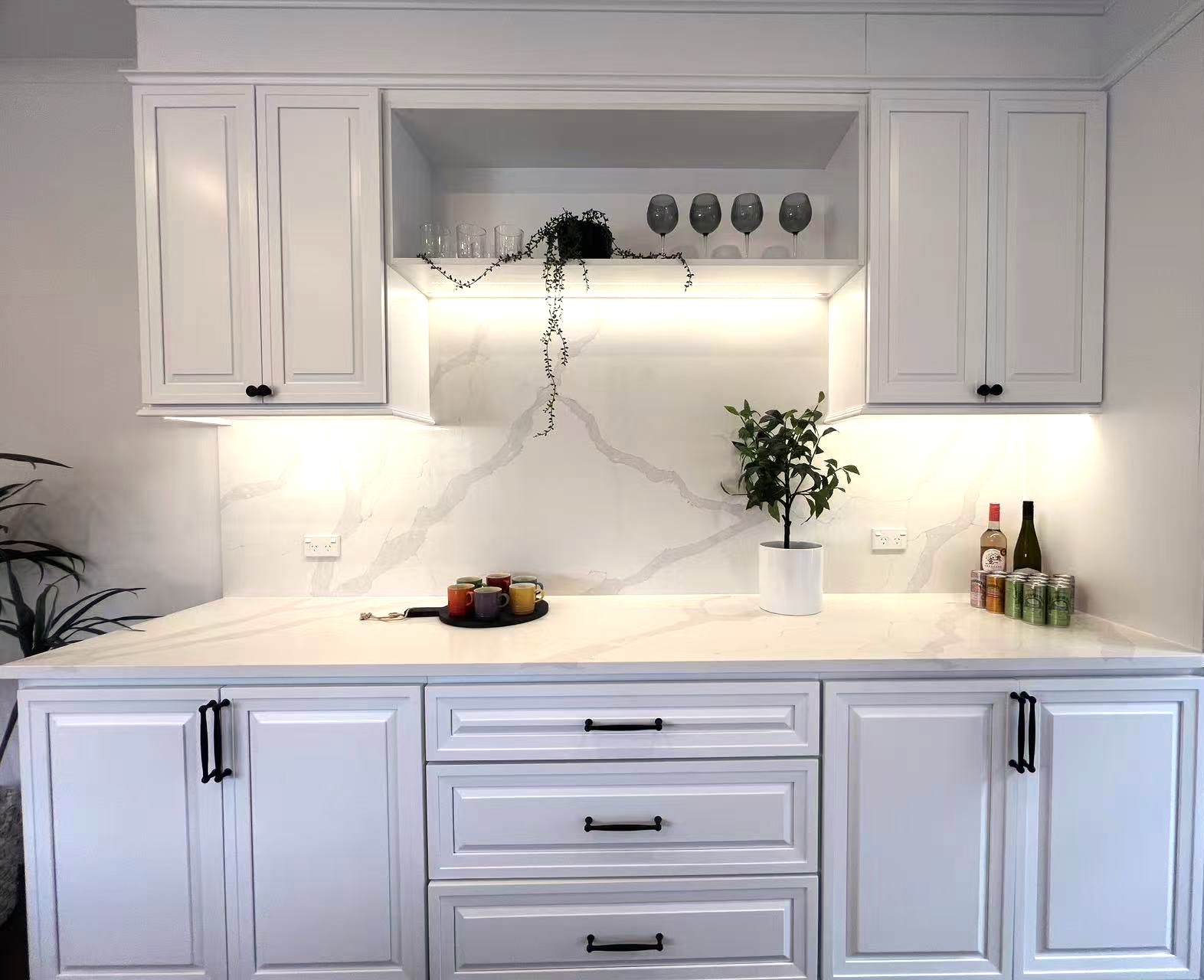 - Bvlgari White (H6342) sintered stone benchtop + full-slab splashback — marble-style veining, heat/scratch/stain resistant