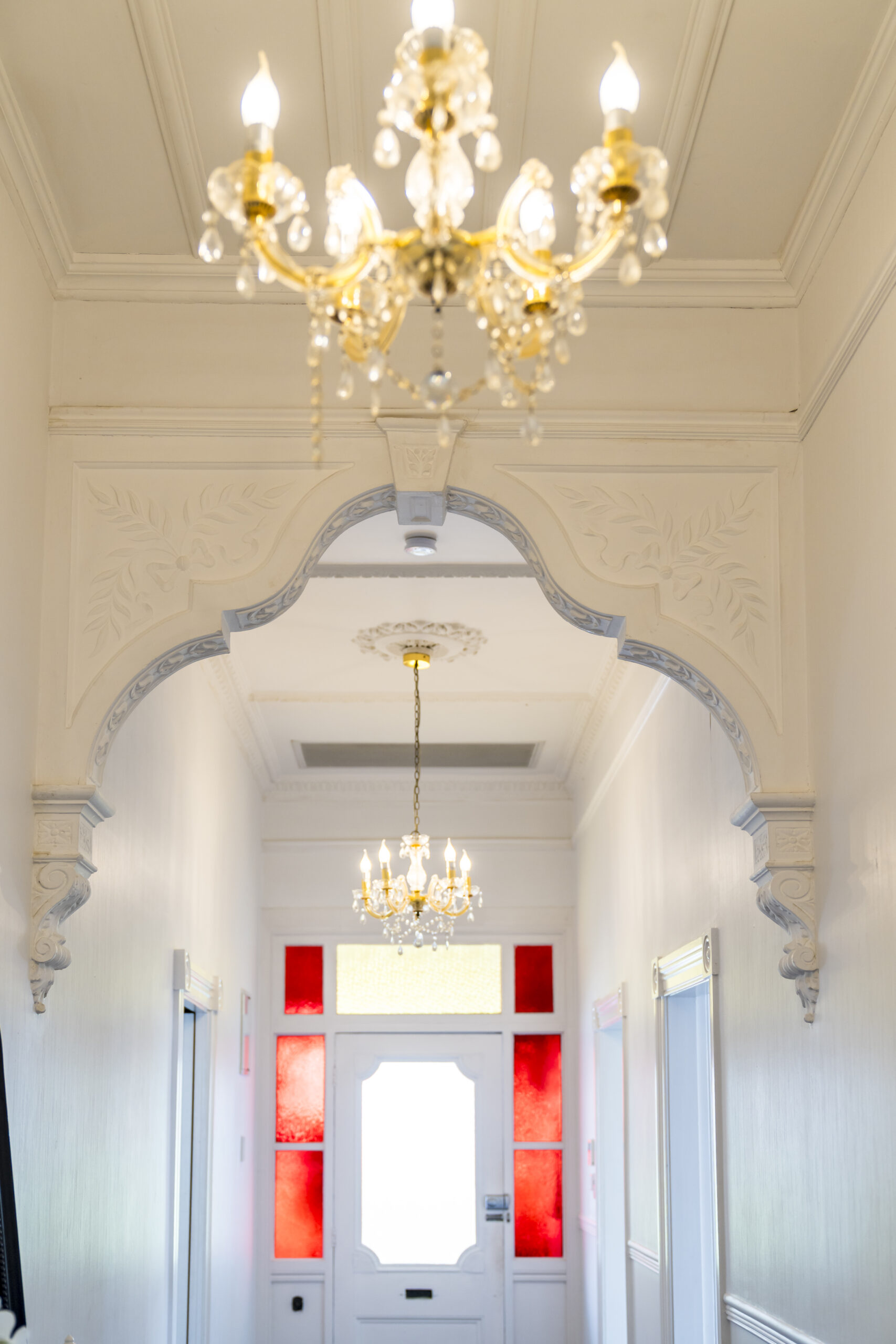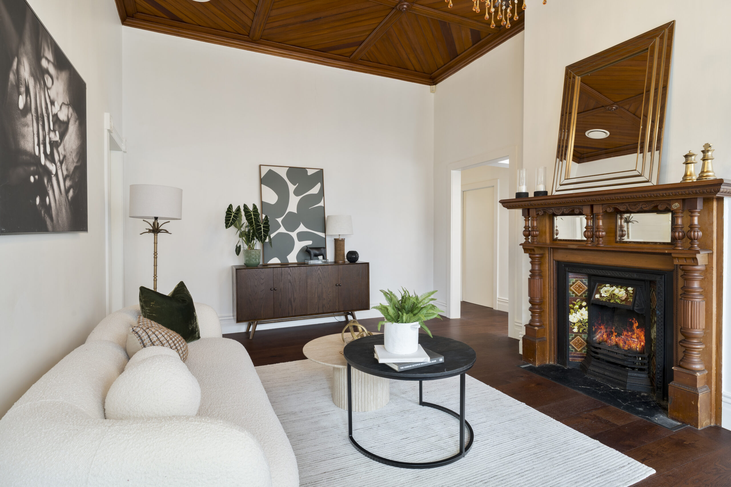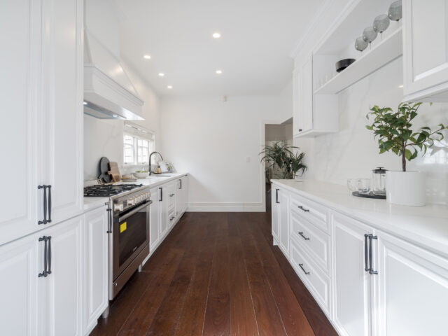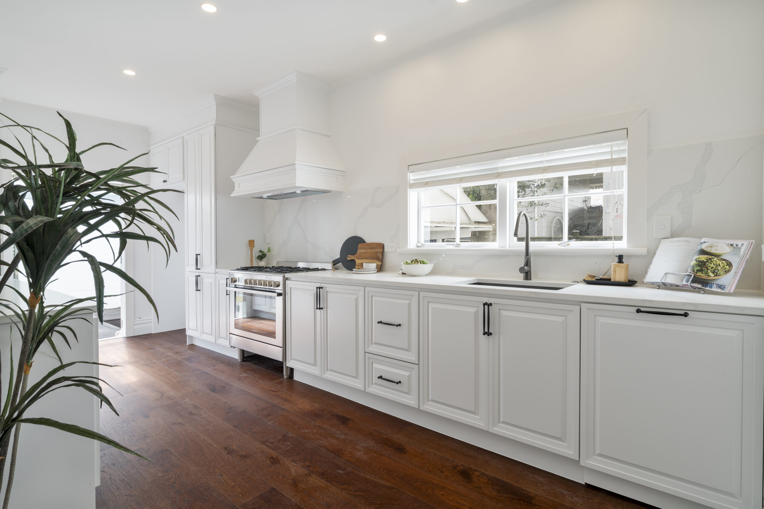 - Bvlgari White (H6342) sintered stone benchtop + full-slab splashback — marble-style veining, heat/scratch/stain resistant