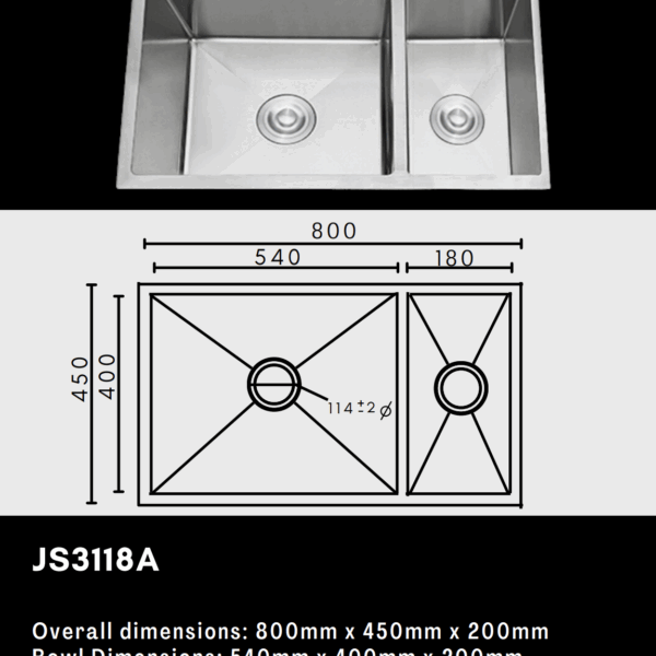 Premium Double Bowl Kitchen Sink 1160x500mm - Stainless Steel - JS894