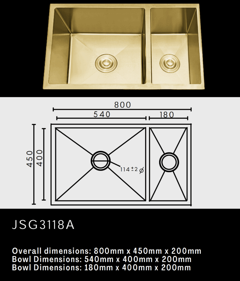 Elevate your kitchen with the JSG3118A Luxury Double Bowl Sink in radiant Gold finish. Measuring 800x450mm, this premium stainless steel sink combines bold elegance with everyday functionality—featuring deep dual bowls ideal for multitasking in sophisticated, contemporary spaces.