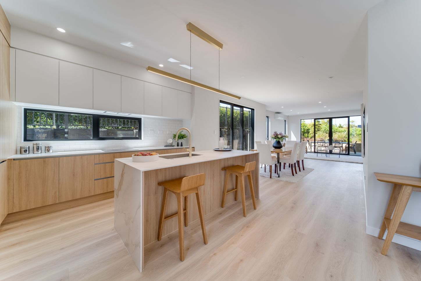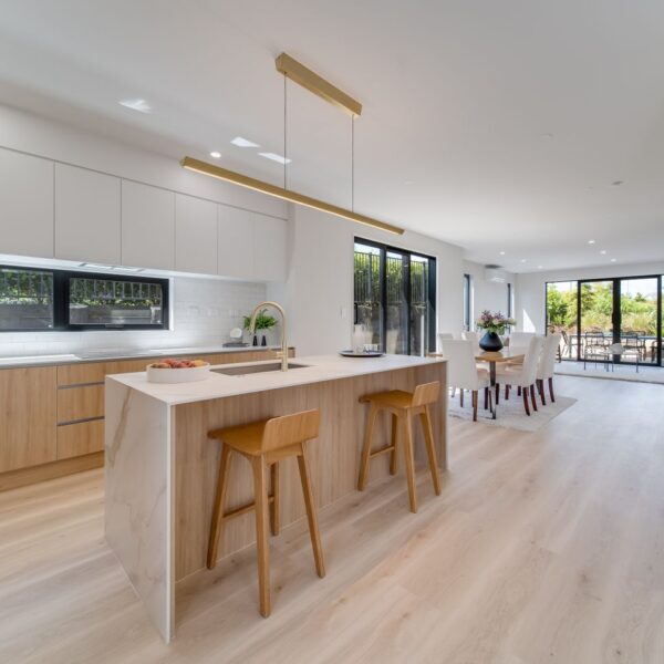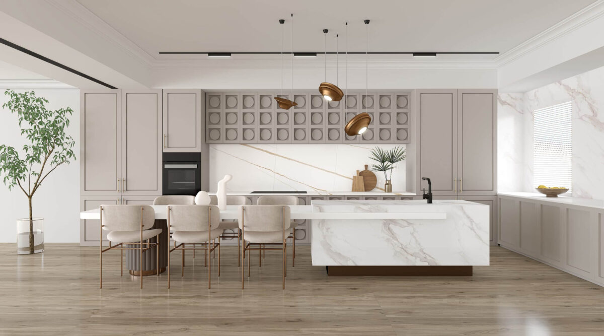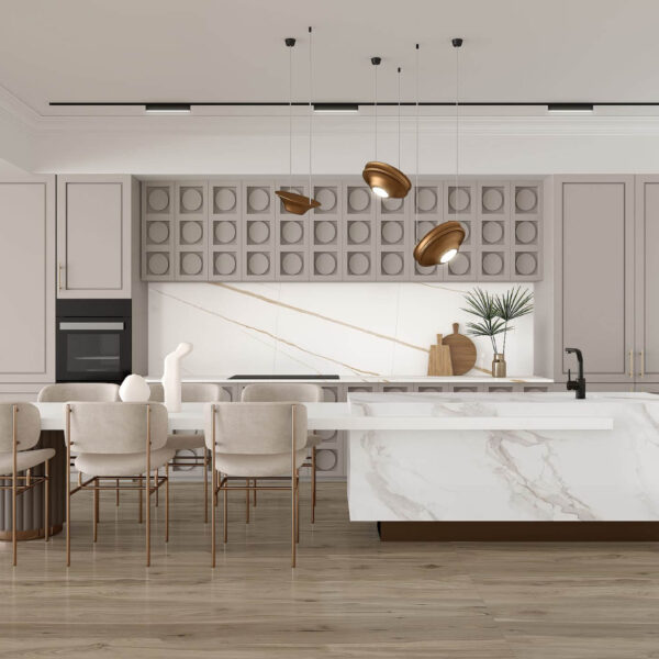 A tropical dream. If you own a beachfront property in New Zealand, the Horizon Stone Karst Gold incorporates styles from all over the world, showcasing colours that complement beachside huts and coastal villas, bringing luxury and tranquilly. The combination of white and neutral colours with brass accents gives the room a serene modern, and contemporary look.