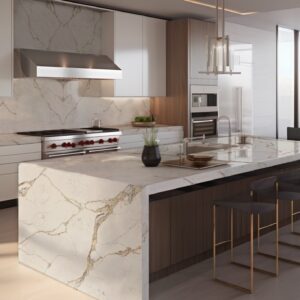 At its core, Calacatta Oro features a silica-free composition, crafted entirely without crystalline silica. This advanced material ensures a safer and healthier surface for fabricators and homeowners, marrying luxurious aesthetics with modern safety and sustainability standards.