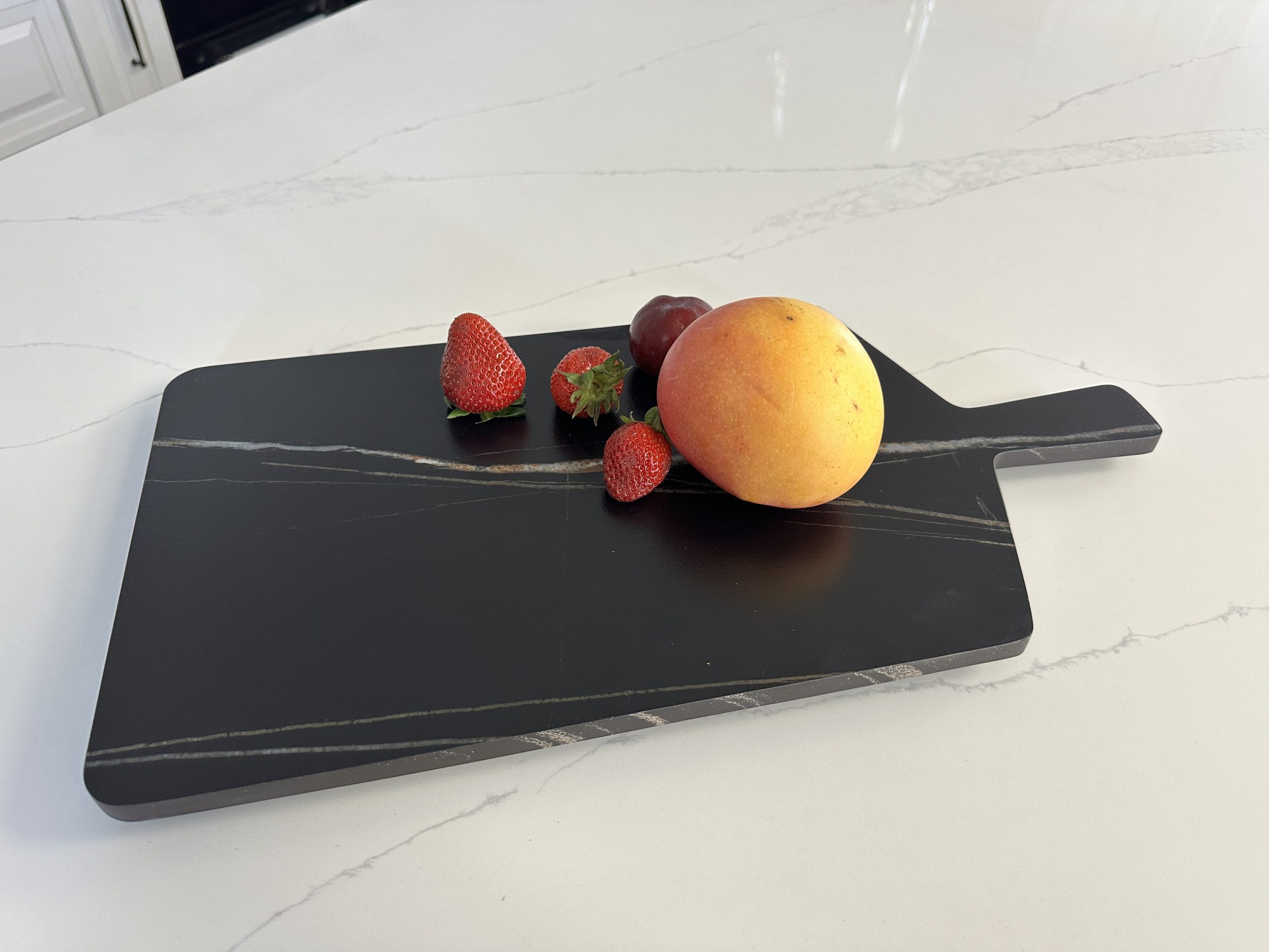 At once practical and elegant. These slate and natural stone-look serving boards are ideal for serving cheese and fruit because they are naturally cool to the touch. Our handcrafted board is shaped with a flourish and polished to a high shine to set off and serve cheeses and accompaniments beautifully.